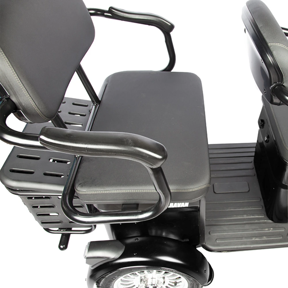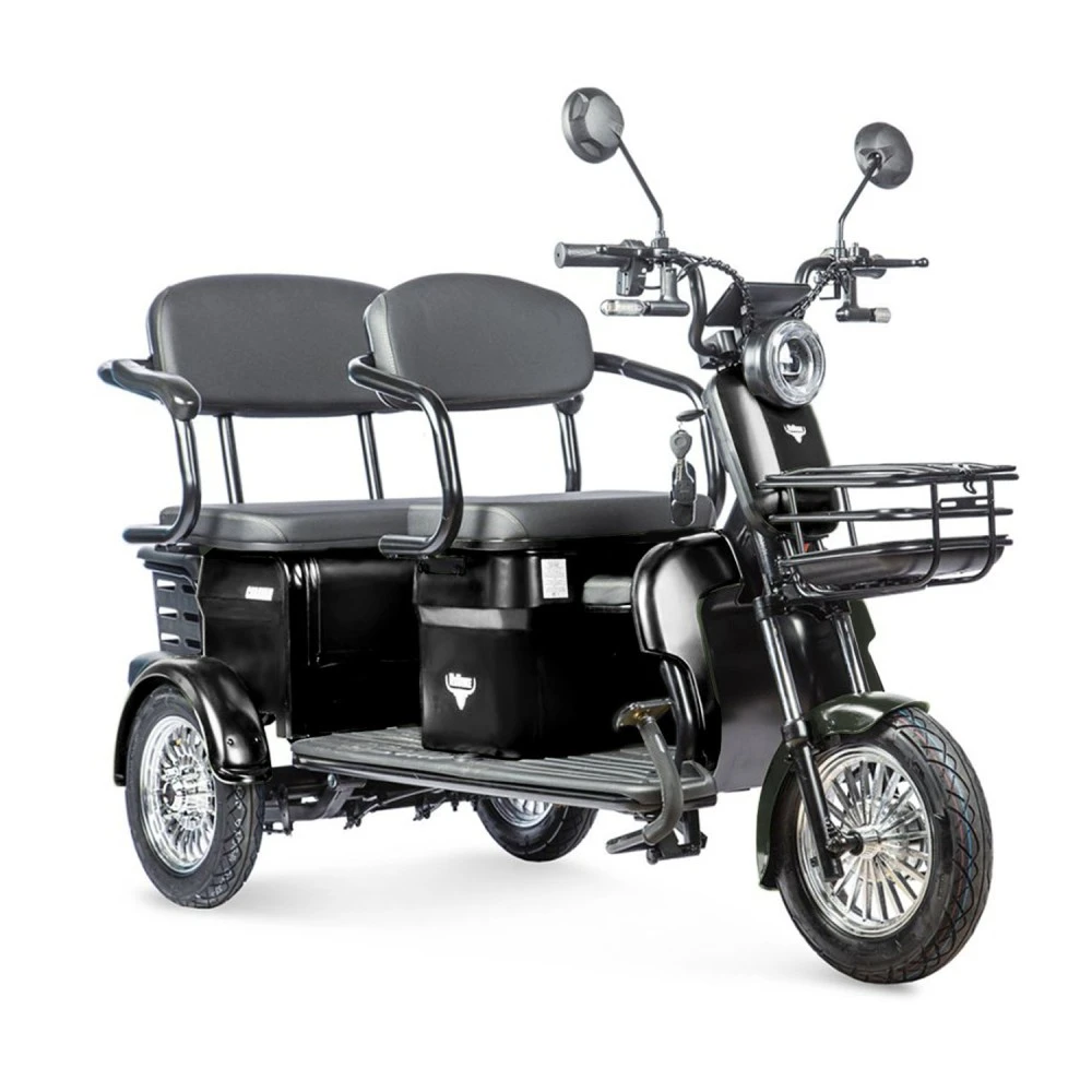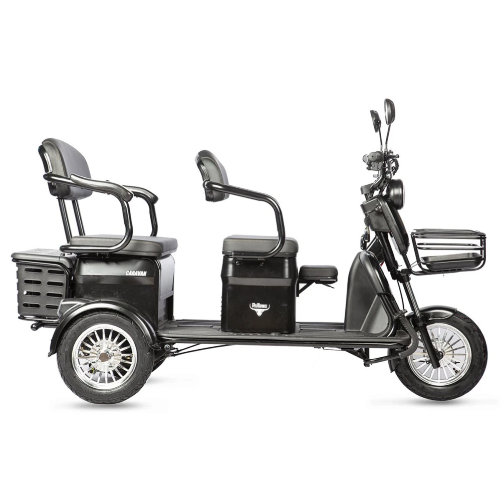 Трицикл Rutrike Караван черный – популярная среди предпринимателей модель. Рассчитана на нескольких ездоков грузоподъемностью до 150 кг. Востребована представителями туристического бизнеса и другими коммерческими организациями. Представлена аккуратным привлекательным дизайном, надежная, безопасная и комфортная. Совершенствованная техническая часть, максимальные показатели комфорта увеличили популярность трицикла, сделали его лидером продаж. Сегодня товар относится к категории быстро раскупаемой. Модель оснащена пассажирским широким местом, имеющим удобную спинку и подлокотники. Тестирование техники доказало удобство передвижения и отсутствие усталости. Технические характеристики юркого трицикла представлены двигателем мощностью 800 Вт, способного развивать скорость до 25 км/час и преодолевать 45 км пути (батарея не предусмотрена в комплектации).   Надеемся, вам понравились характеристики трицикла и вы решили на собственном опыте, узнать, что такое удобство на минимальных скоростях. Связаться с нами для заказа или покупки техники сейчас предлагаем по телефону или в онлайн-режиме.