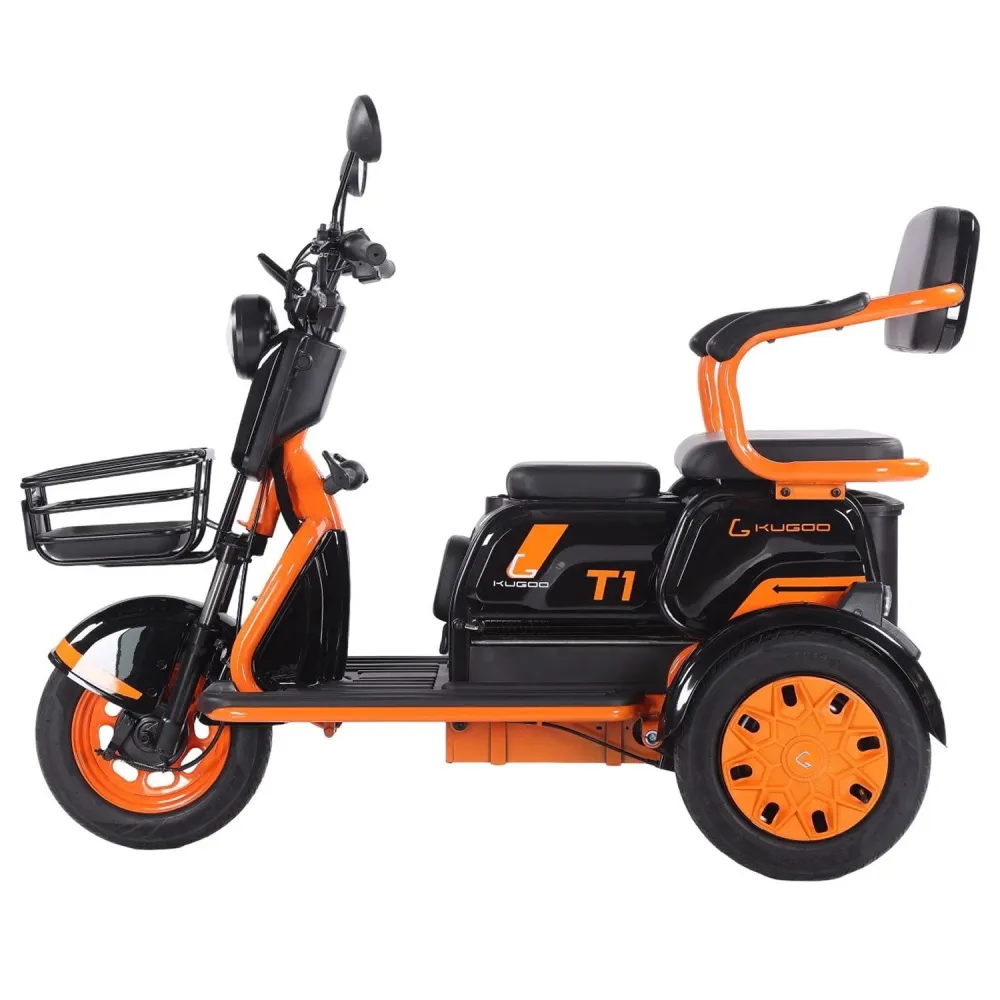 Kugoo T1 — это компактный трёхколёсный электровелосипед с прочной алюминиевой рамой, задним приводом и мотором мощностью 500 Вт. Оснащён литий-ионным аккумулятором 48 V / 20.8 Ah, 3-ступенчатой трансмиссией и барабанными тормозами.
