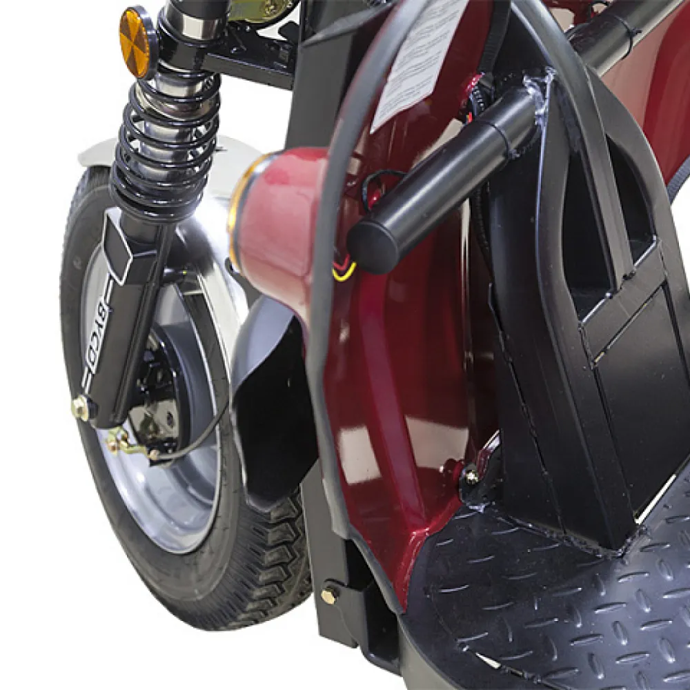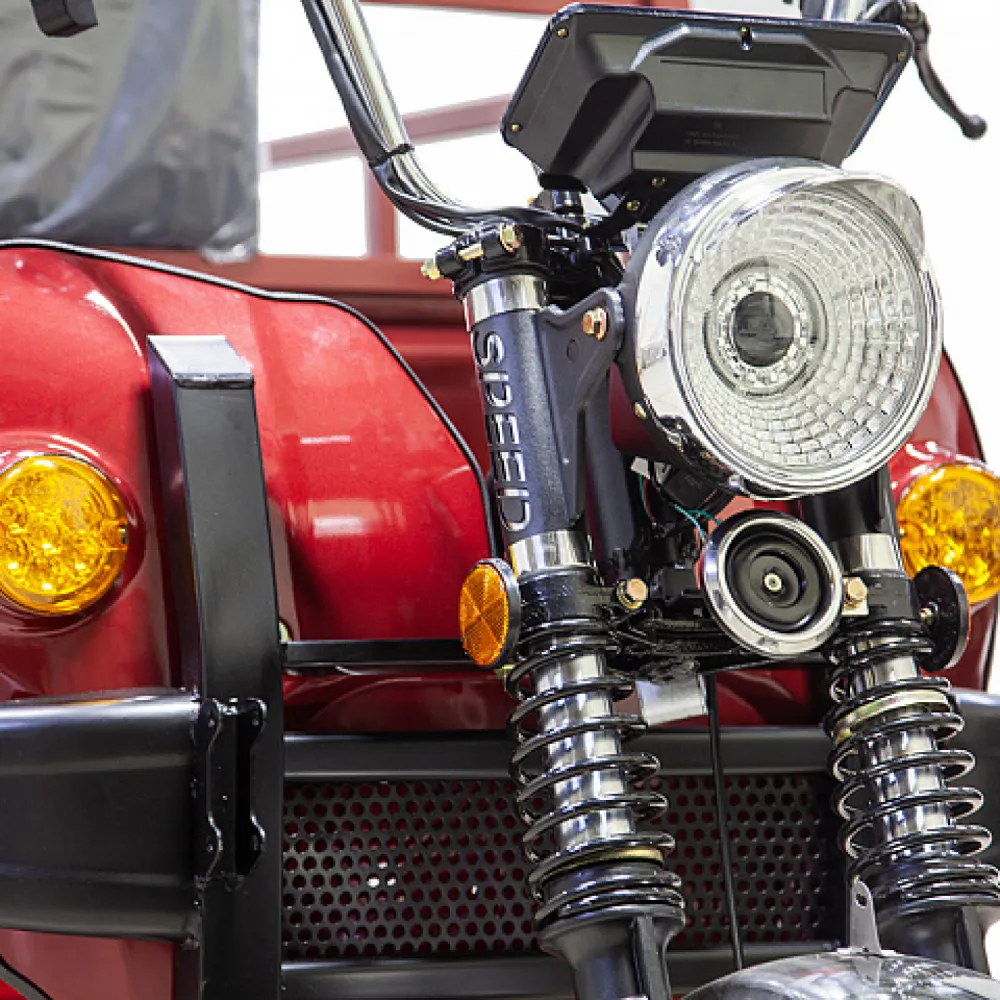 Темно-серый грузовой электротрицикл Rutrike D4 1800 60V1500W практичная многофункциональная техника, обеспеченная необходимыми для комфортного использования аксессуарами и деталями. Имеет зеркала заднего вида, качественную тормозную систему, мощную светодиодную фару, компактное сиденье, повторяющее анатомические части тела и снижающие нагрузку с позвоночника.