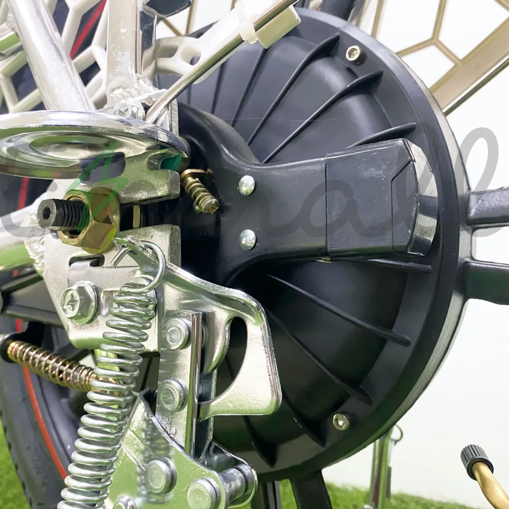 Двигатель выполнен в виде мотора-колеса. Оно способно разогнать велосипед до 50 км/ч, а его расположение сделало раму низкой и более комфортной в сравнении с обычными велосипедными рамами. Питается электромотор от аккумулятора мощностью 12 Ач, но помимо того, в комплекте идёт дополнительный аккумулятор ёмкостью целых 20 Ач, что в совокупности даёт до 120 километров хода без подзарядки. Всю необходимую информацию во время движения можно отслеживать на дисплее бортового компьютера, который находится на руле велосипеда.